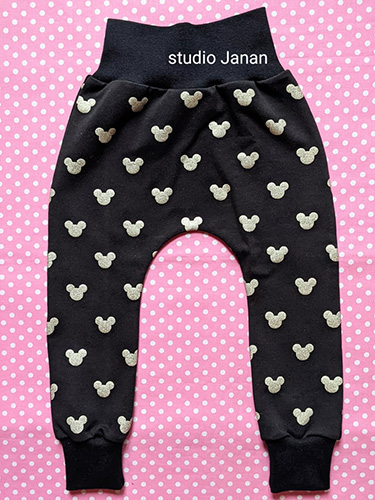 Baggy z příjemné teplákoviny se zlatými Mickey na černém podkladu.
