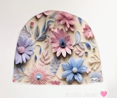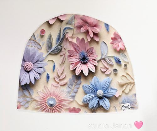 Čepice se vzorem plastických květů na béžovém podkladu.