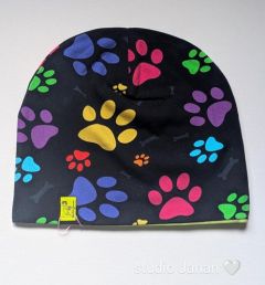 Čepice se vzory větších barevných tlapek na černém podkladu.
