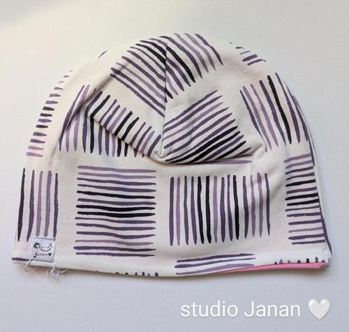 Čepice se vzorem čar fialkových na bílém podkladu.