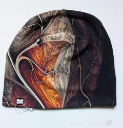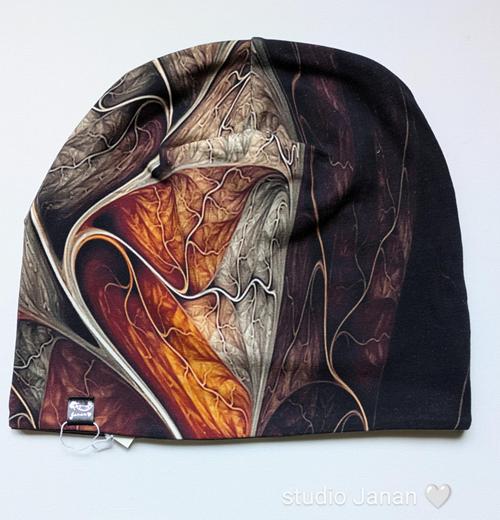 Čepice s mramorovými vzory tmavých barev.