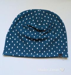 Čepice se vzorem kapek na petrolej podkladu.
