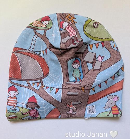 Čepice se vzorem dětí či skřítků, kteří si hrají na hřišti na stromě.
