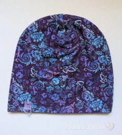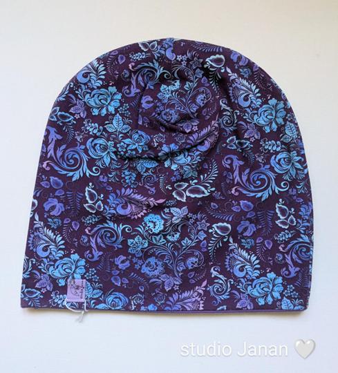 Čepice se vzorem Folklóru ve fialových odstínech.