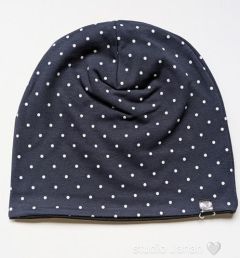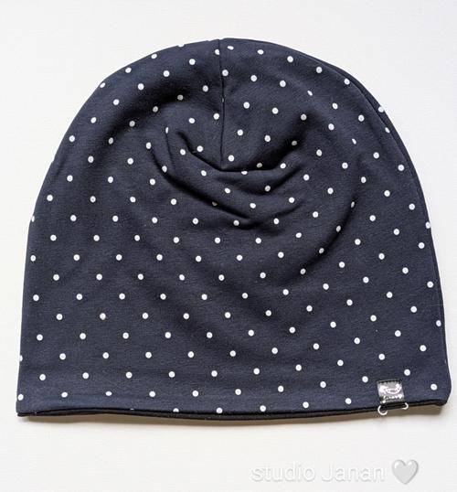 Čepice s puntíky na tmavě modrém podkladu.