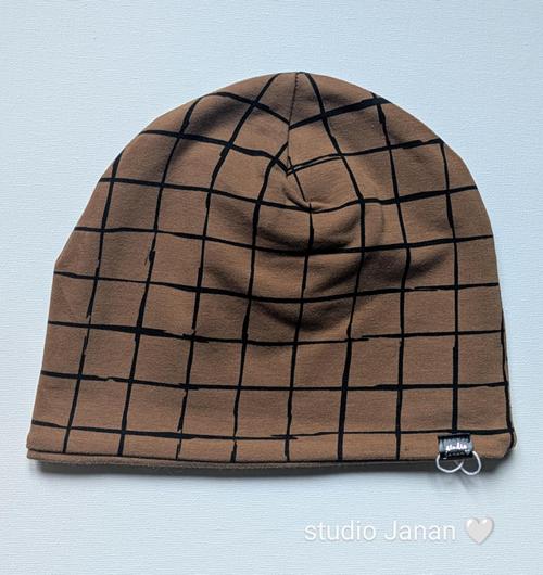 Čepice se vzorem kostek na hnědém podkladu.