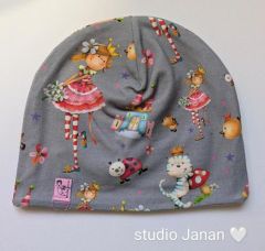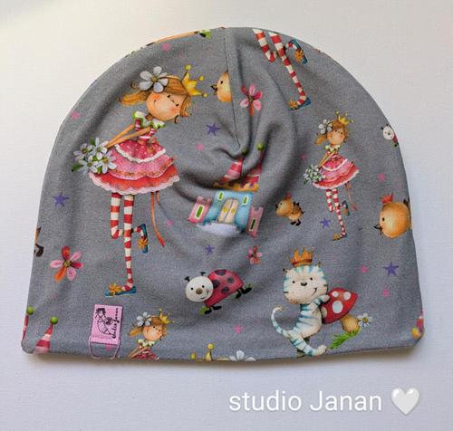 Čepice se vzorem princezen a království na šedivém podkladu.