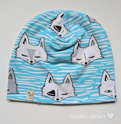 Čepice se vzorem bílých lišek.