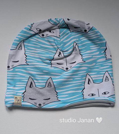 Čepice se vzorem lišek na bílomodrém podkladu.