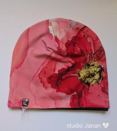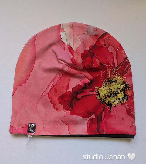Čepice se vzorem vlčího máku.