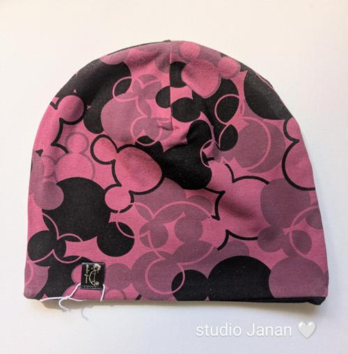 Čepice se vzorem Mickey Mouse či Minnie v bordočerném odstínu.
