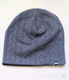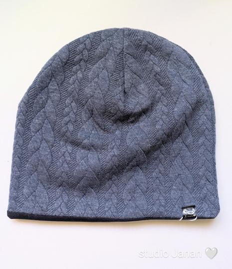 Čepice se vzorem modré pleteniny šitém z copánkoviny teplákoviny.