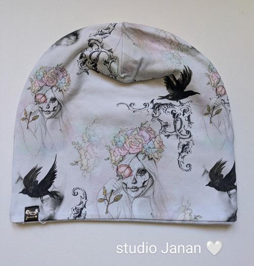 Čepice se vzorem Gotic Muertos na světle šedém podkladu.