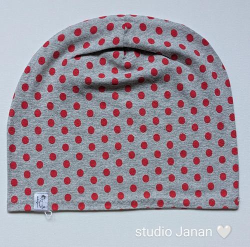 Čepice se vzorem oranžových puntíků na šedém podkladu.