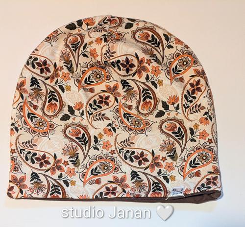 Čepice se vzory hnědých ornamentů.