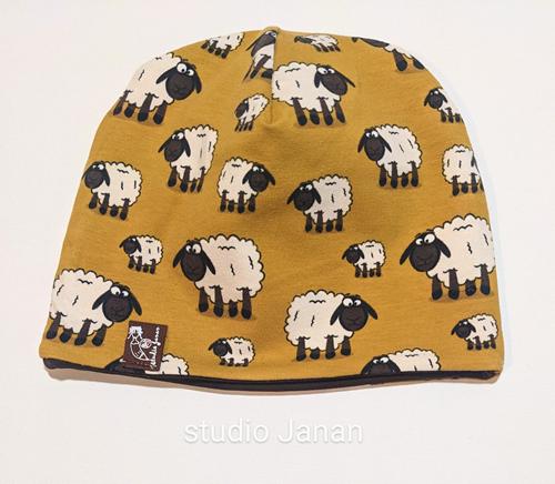 Čepice se vzorem oveček na okr podkladu.