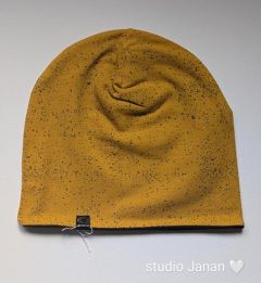 Čepice se vzorem drobných černých teček na pískovém podkladu.