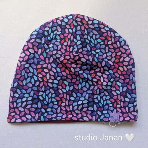 Čepice pro panenku se vzorem barevných zrníček.