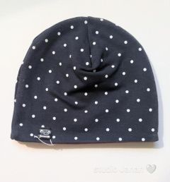 Čepice se vzorem drobných puntíků na temně modrém podkladu.