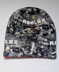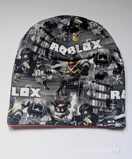 Čepice se vzorem Roblox na šedivém podkladu.