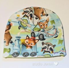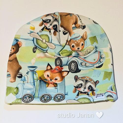 Čepice se vzorem zvířátek v dopravních prostředcích.