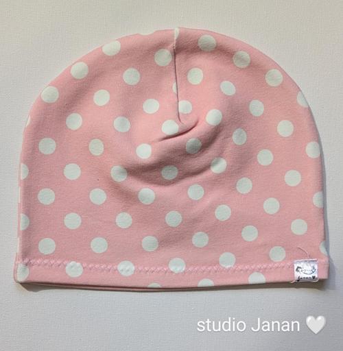 Čepice se vzor bílých puntíků na růžovém podkladu.