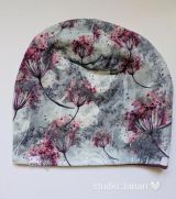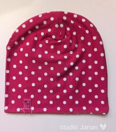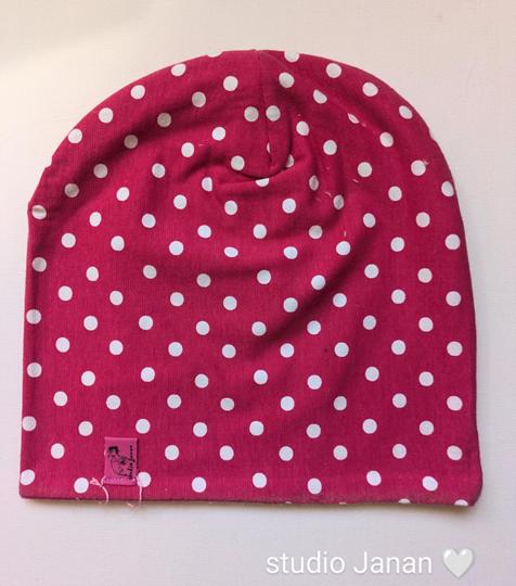 Čepice se vzorem bílých puntíků na rúžovém podkladu.