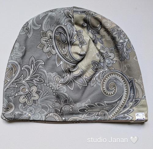 Čepice s béžovo-šedivými ornamenty.