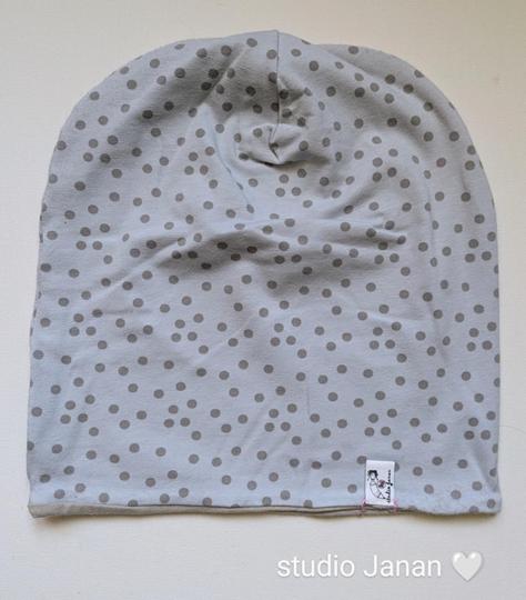 Čepice se vzory šedivých puntíků.