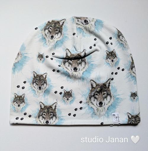 Čepice s vlky na bílém podkladu.