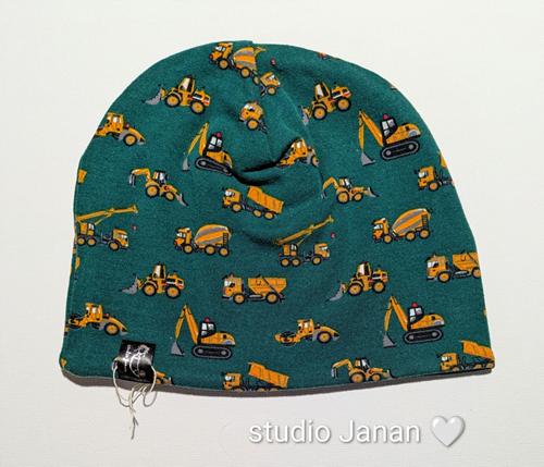 Čepice se vzorem malých stavebních strojů na temně zeleném podkladu.