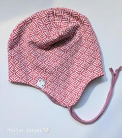 Čepice ušatka s provázky v dekoru lístečků v oranžovém odstínu.