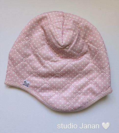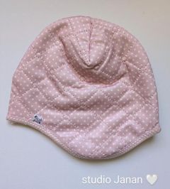 Čepice se vzorem drobných puntíků šitá teplákoviny s beránkem, je tedy velmi teplá.