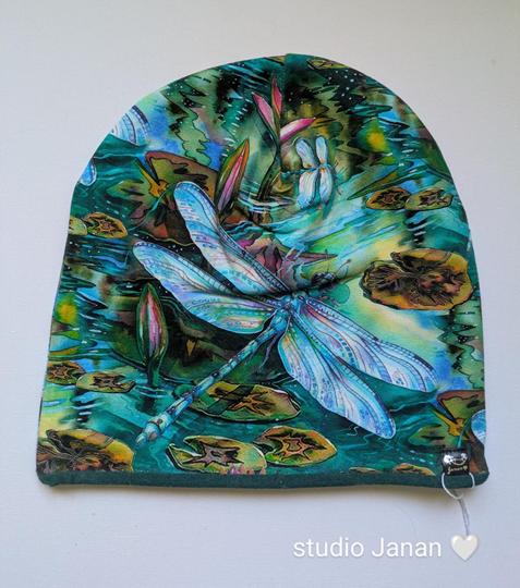 Čepice se vzorem velkých vážek na zelenkavém podkladu.