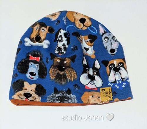 Čepice se vzorem psů na temně modrém podkladu.