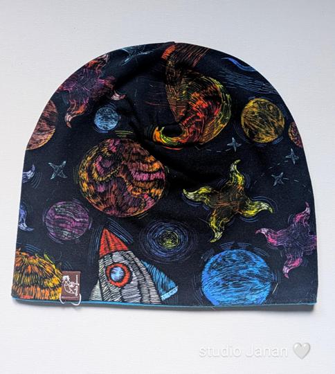Čepice se vzory planet a vesmíru na tmavě modrém podkladu.