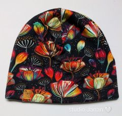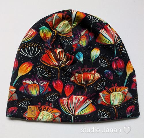 Čepice se vzorem vlčích máků na černém podkladu.