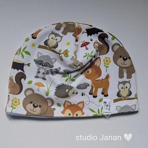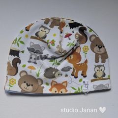 Čepice se vzorem lesních zvířátek na bílém podkladu.
