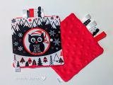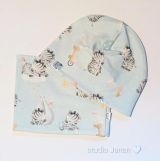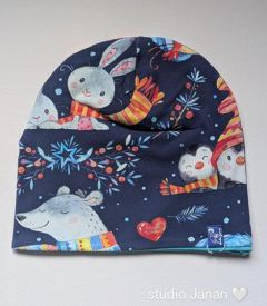Čepice se vzorem zvířátek v zimě na modrém podkladu.