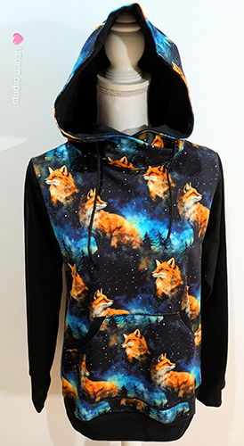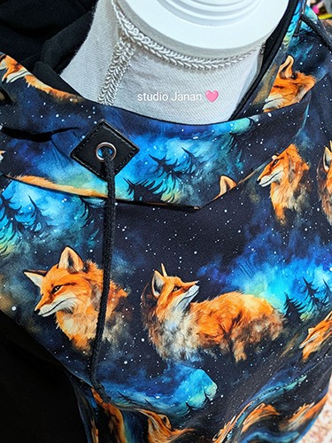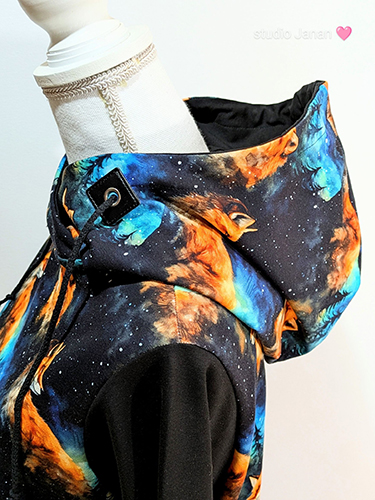 Kapuce je krásně hluboká a lze stáhnout tkaničkou. Vše lemováno černým nápletem.