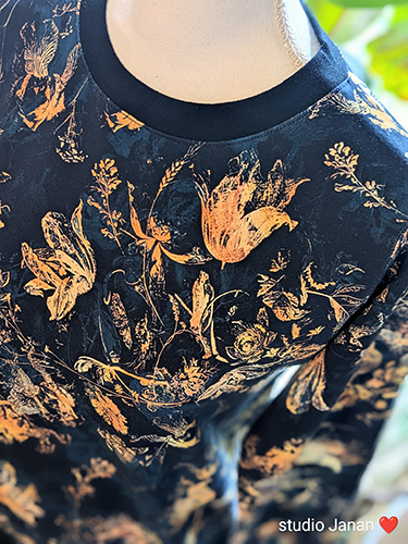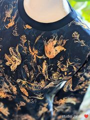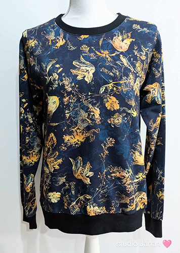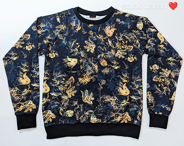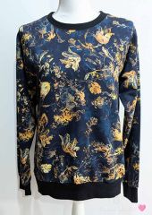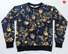 Dámská mikina vel.M se zlatými květy na temně modrém odstínu, šitá z teplákoviny. Bez kapes. Lemována temně modrým nápletem.