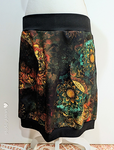 Dámská sukně balónového střihu v dekoru hnědozelených mandal.