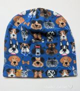 Čepice se vzory psů na modrém podkladu.