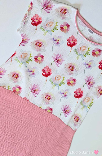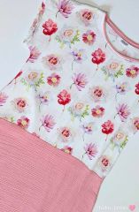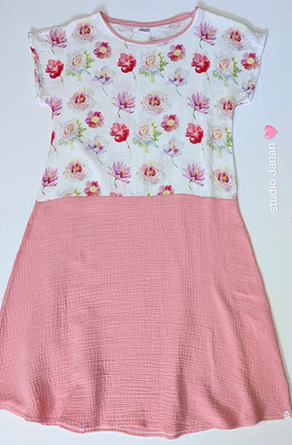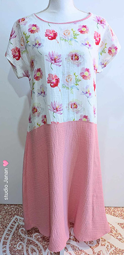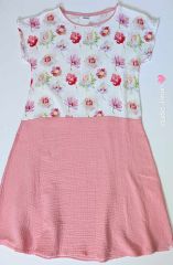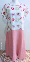 Látka je velmi jemná a příjemná na dotek. Šaty jsou klasického střihu kombinace dvou látek, dekoru s květy a růžové. Bez kapes.