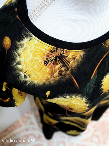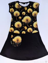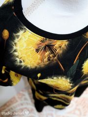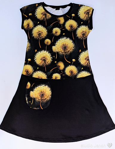 Dámské šaty šité z úpletu v dekoru pampelišek a spodního černého dílu. Jedna větší kapsa pampelišková. Rukávy a kapsa lemováno černým nápletem.