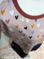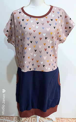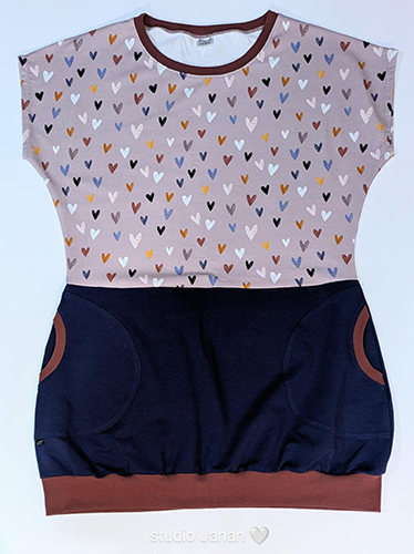 Dámské šaty netopýřího střihu šité z teplákoviny v dekoru srdíček a spodního temně modrého dílu, lemováno hnědým nápetem. Dvě kulaté kapsy.
