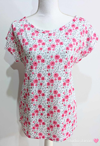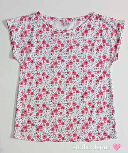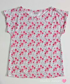 Dámské tričko vel.L šité z úpletu v dekoru květů s krátkým rukávem.