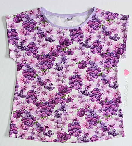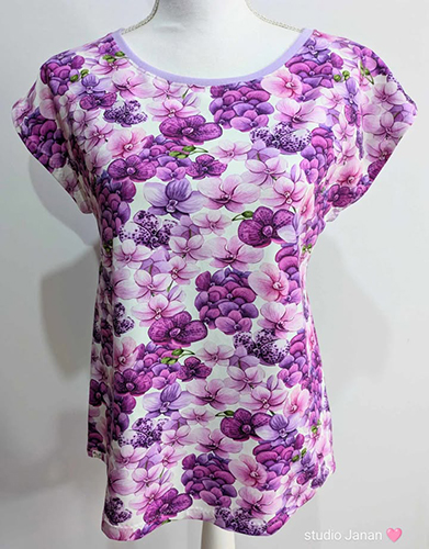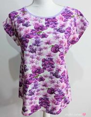 Dámské tričko vel.L šité z úpletu v dekoru macešek s krátkým rukávem.
