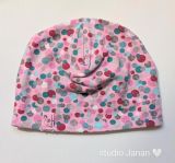 Čepice se vzorem barevných bublinek na růžovém podkladu.