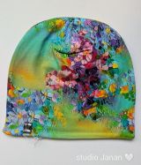 Čepice se vzorem duhových koček s květinami.